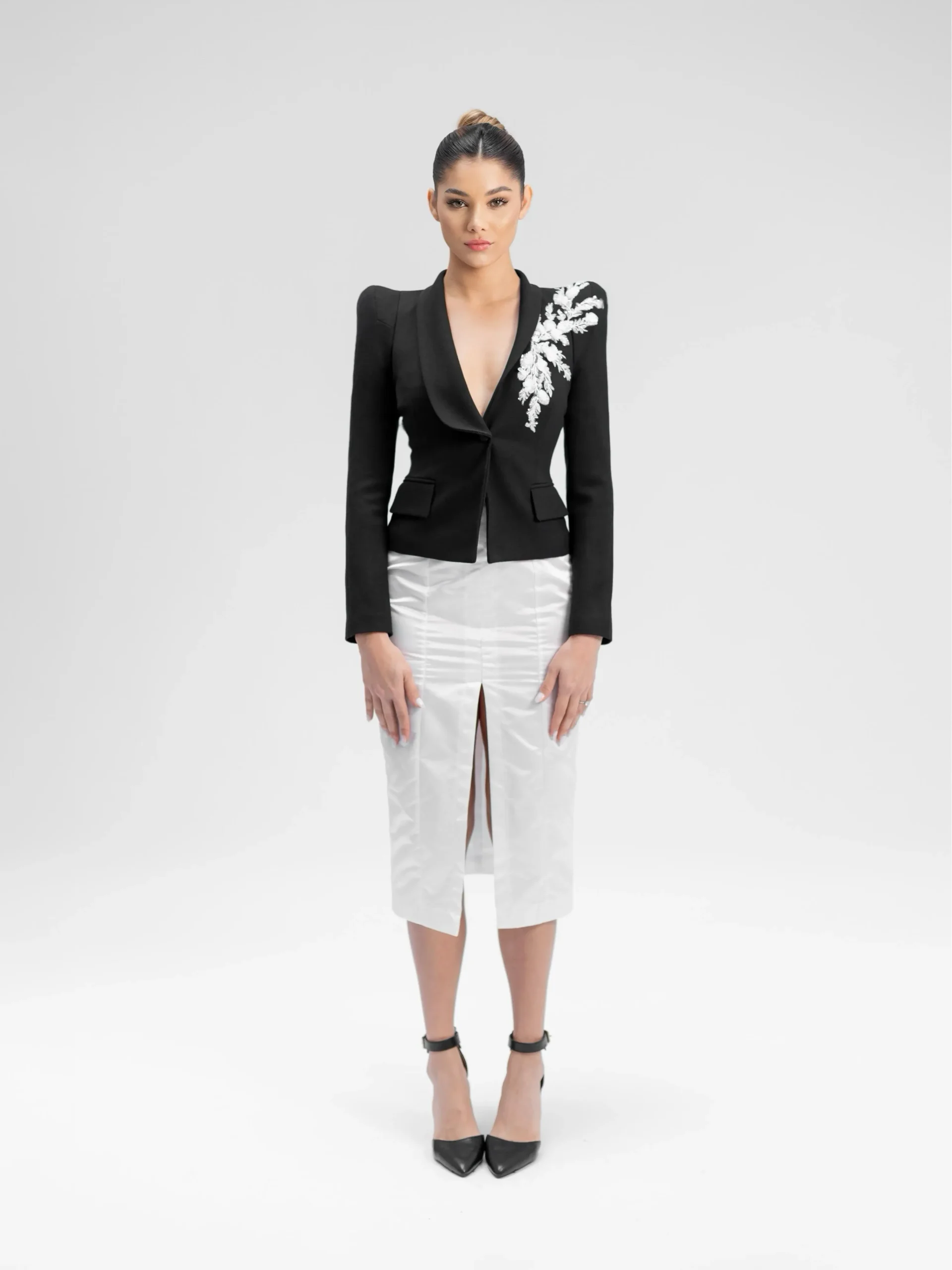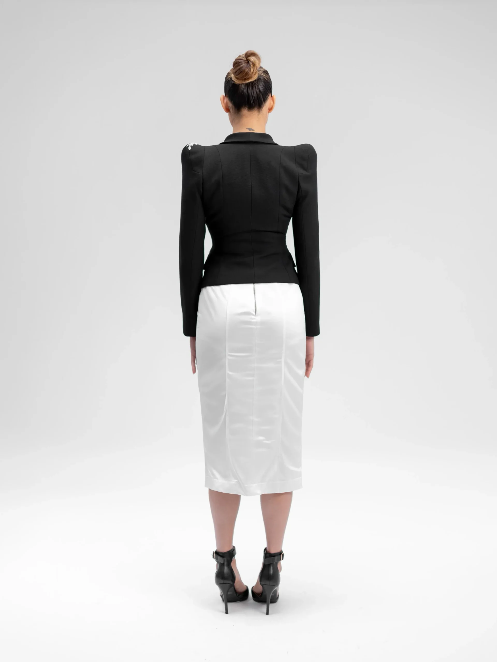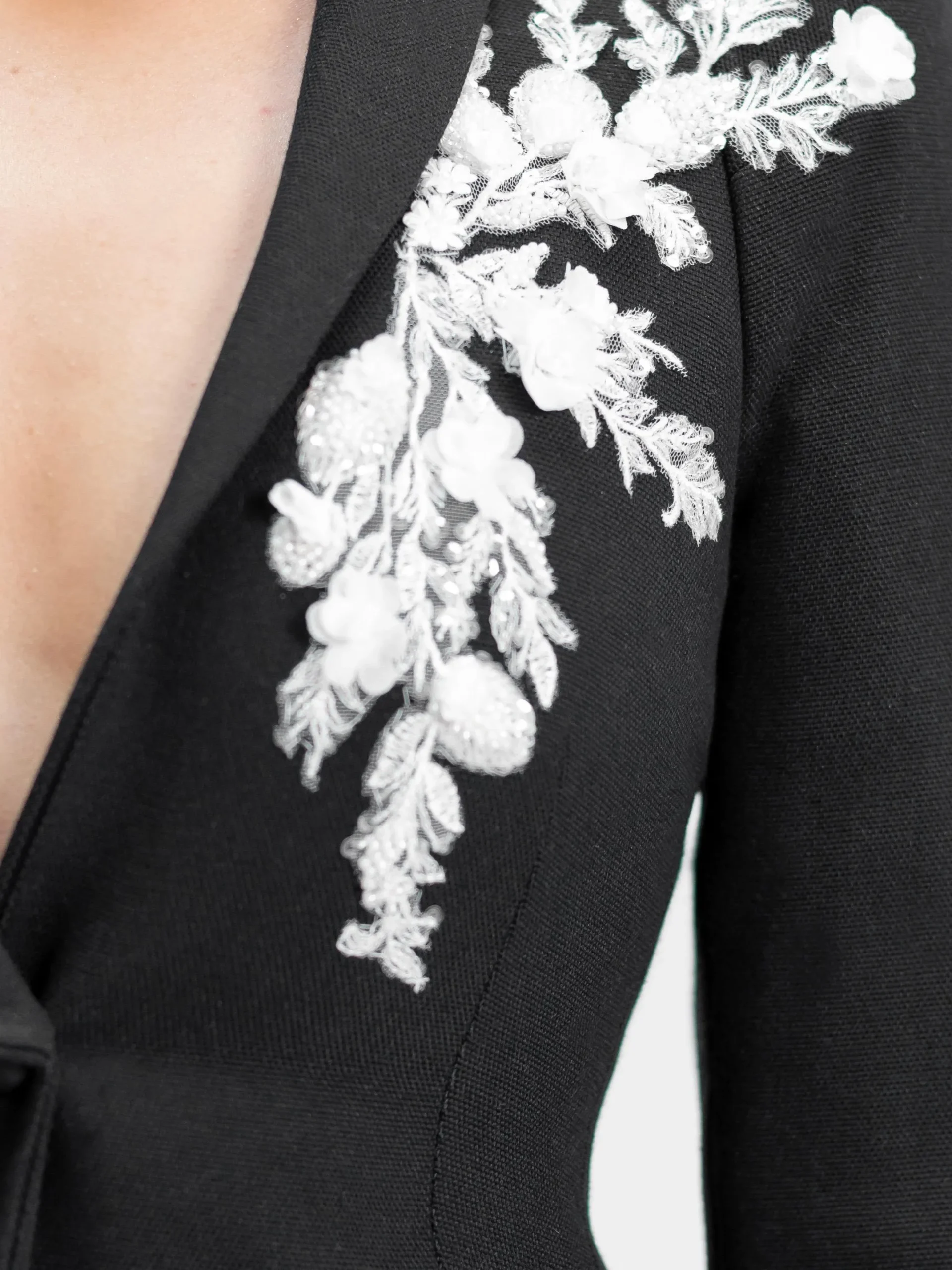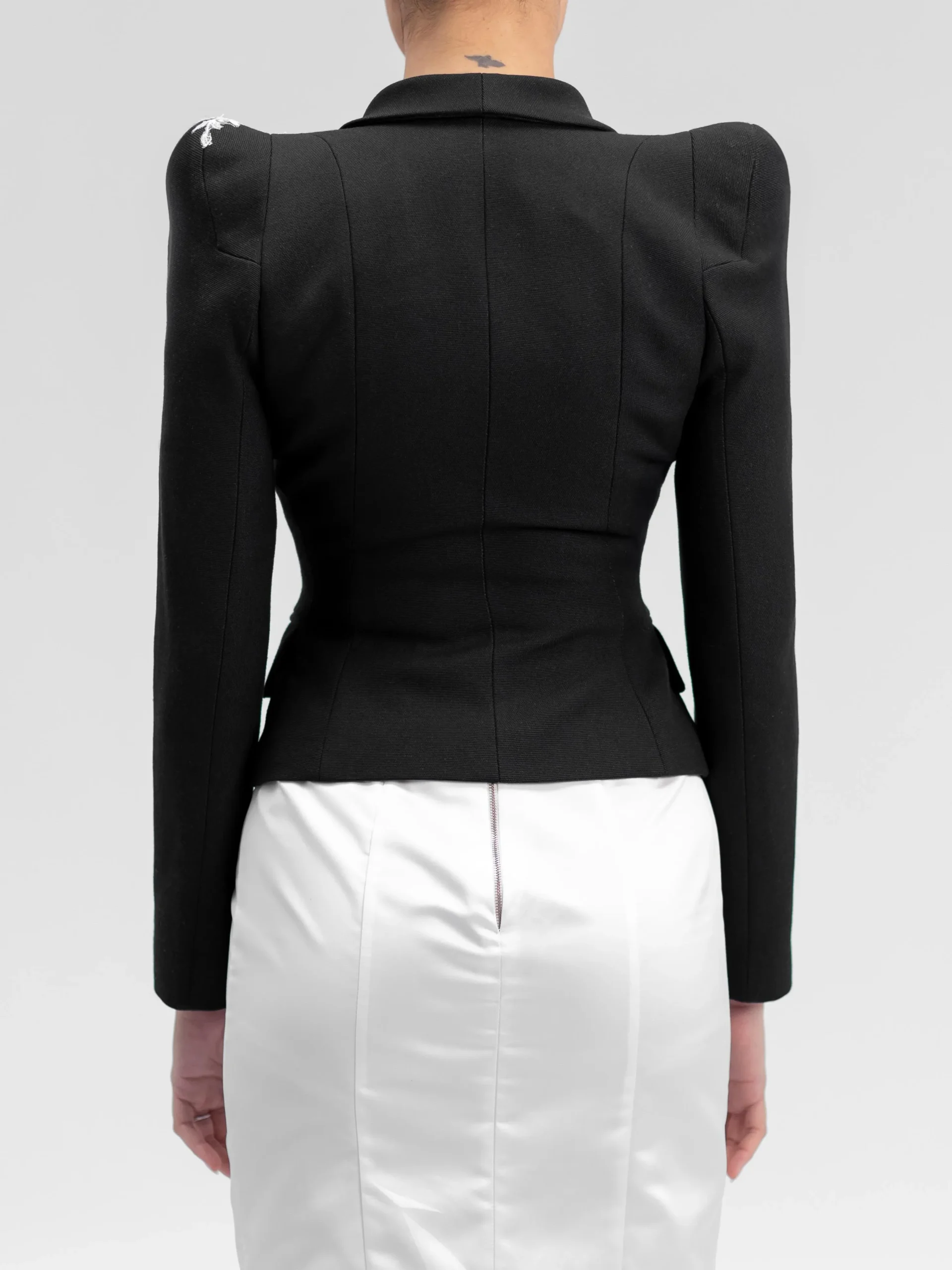 Description : Vests en laine noire avec un design ajusté et des épaules structurées. Ce modèle présente un revers arrondi, des