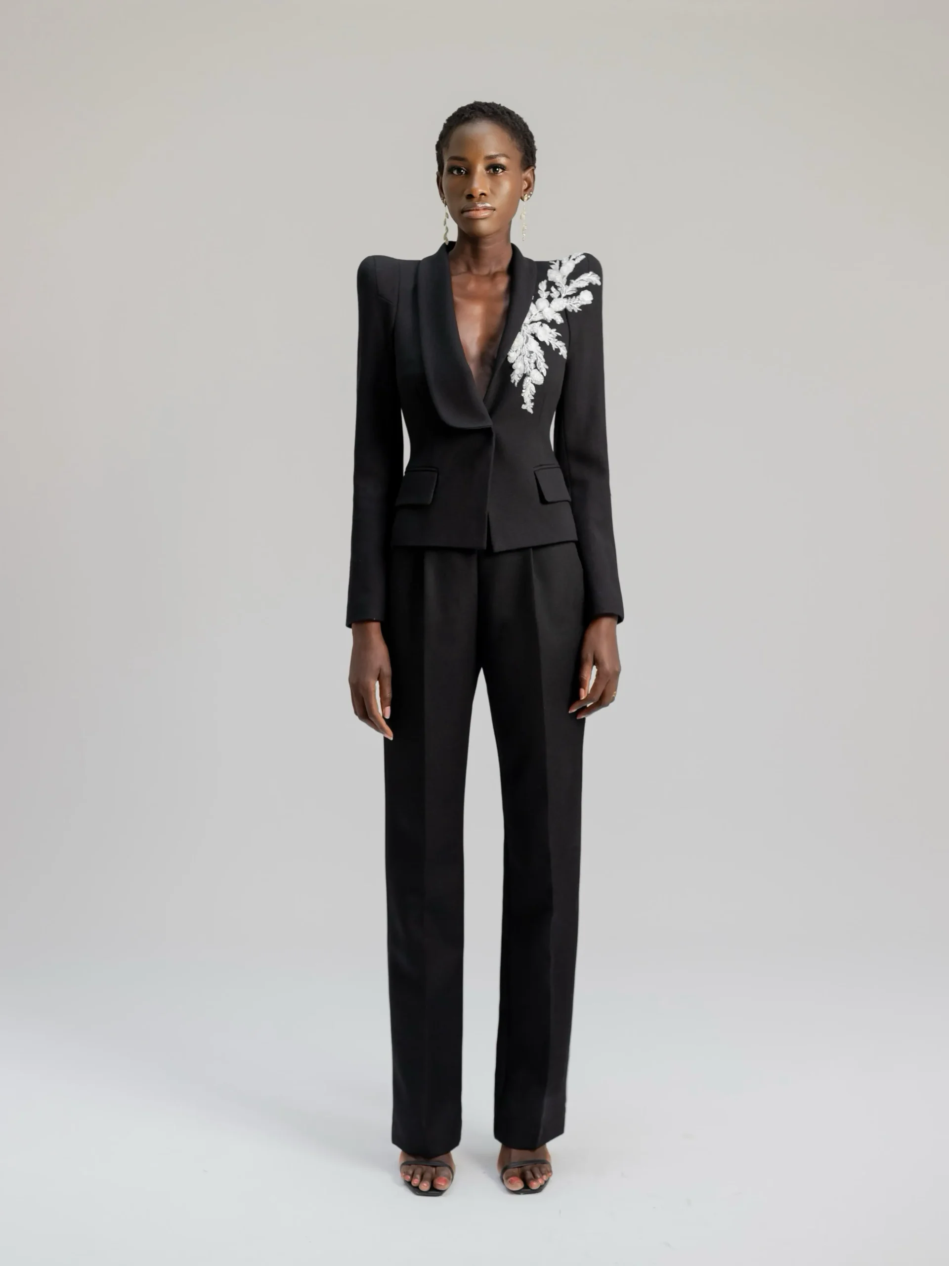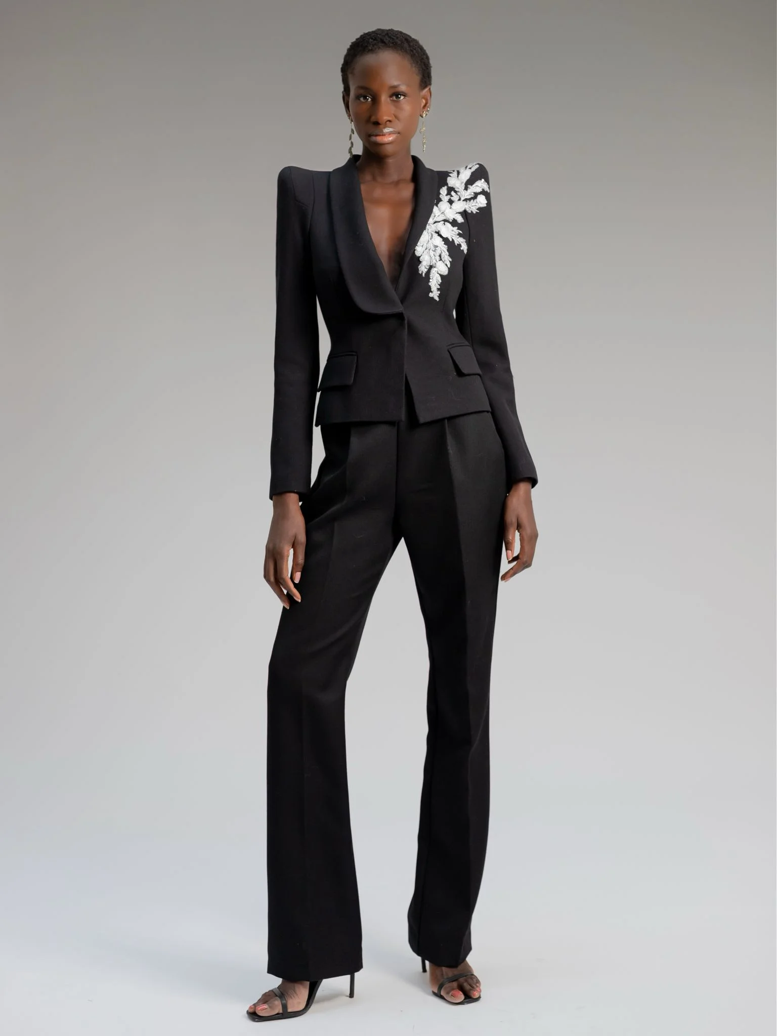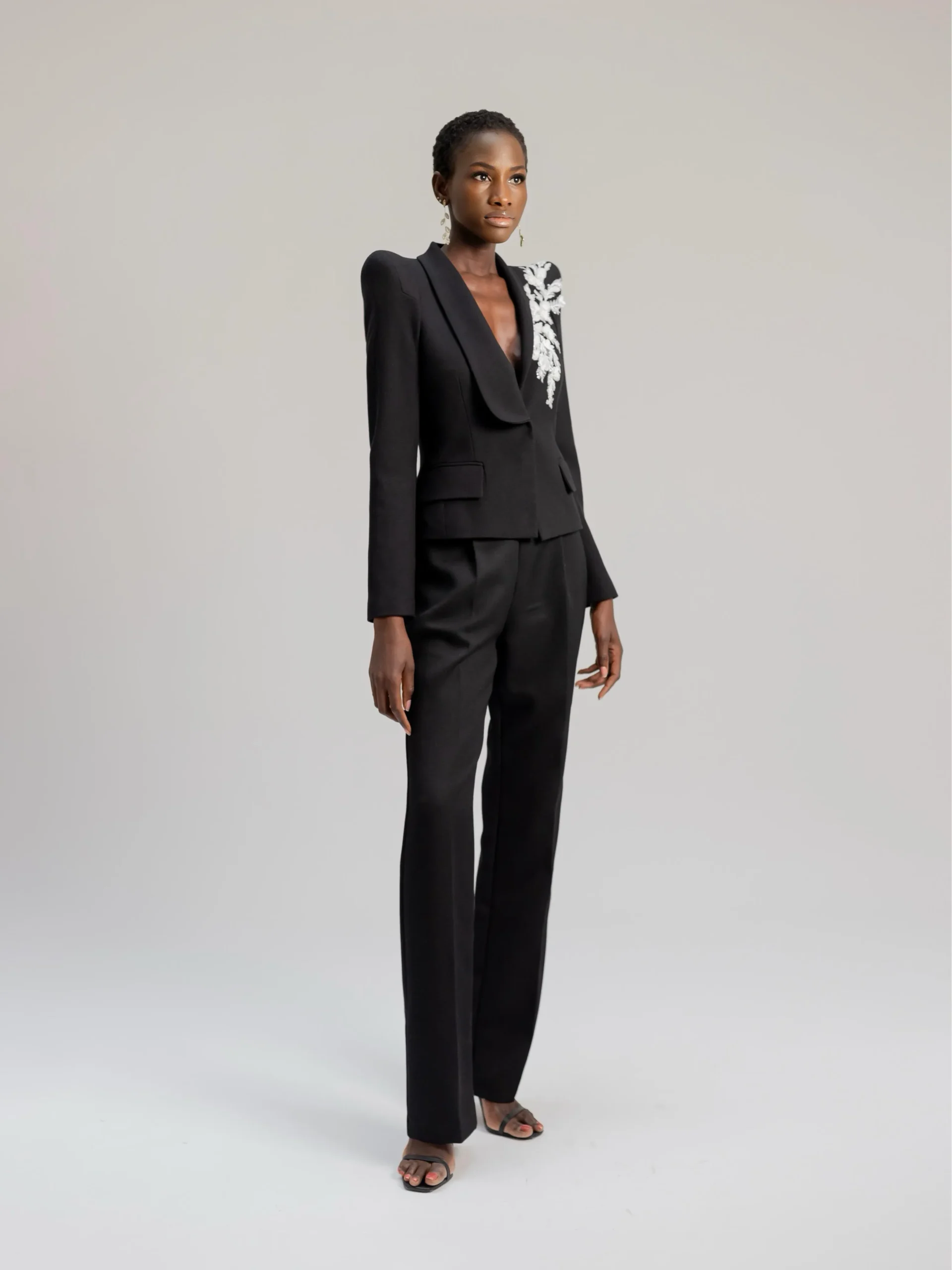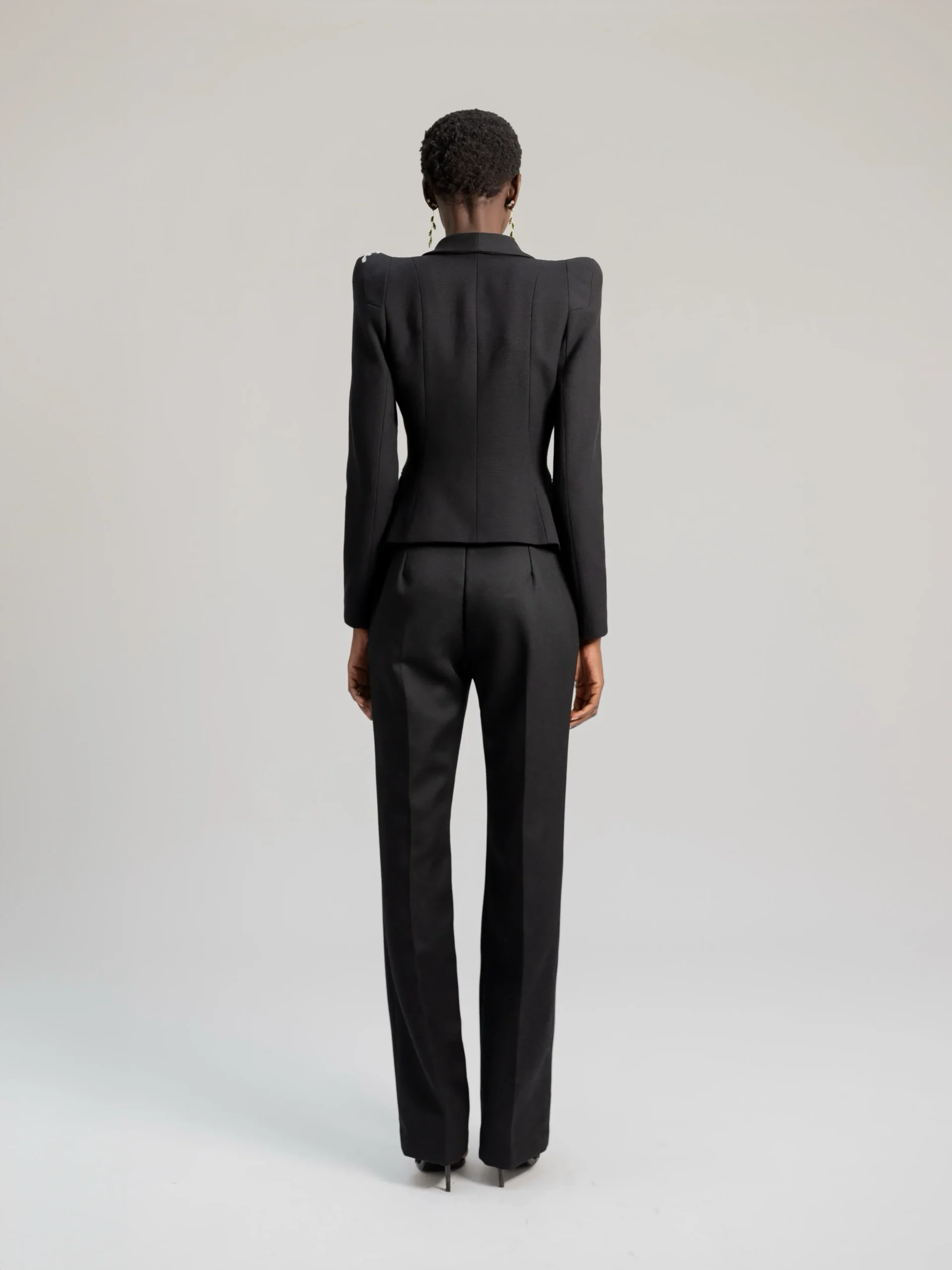 Description : Pantalon ajusté taille haute en laine noire, avec