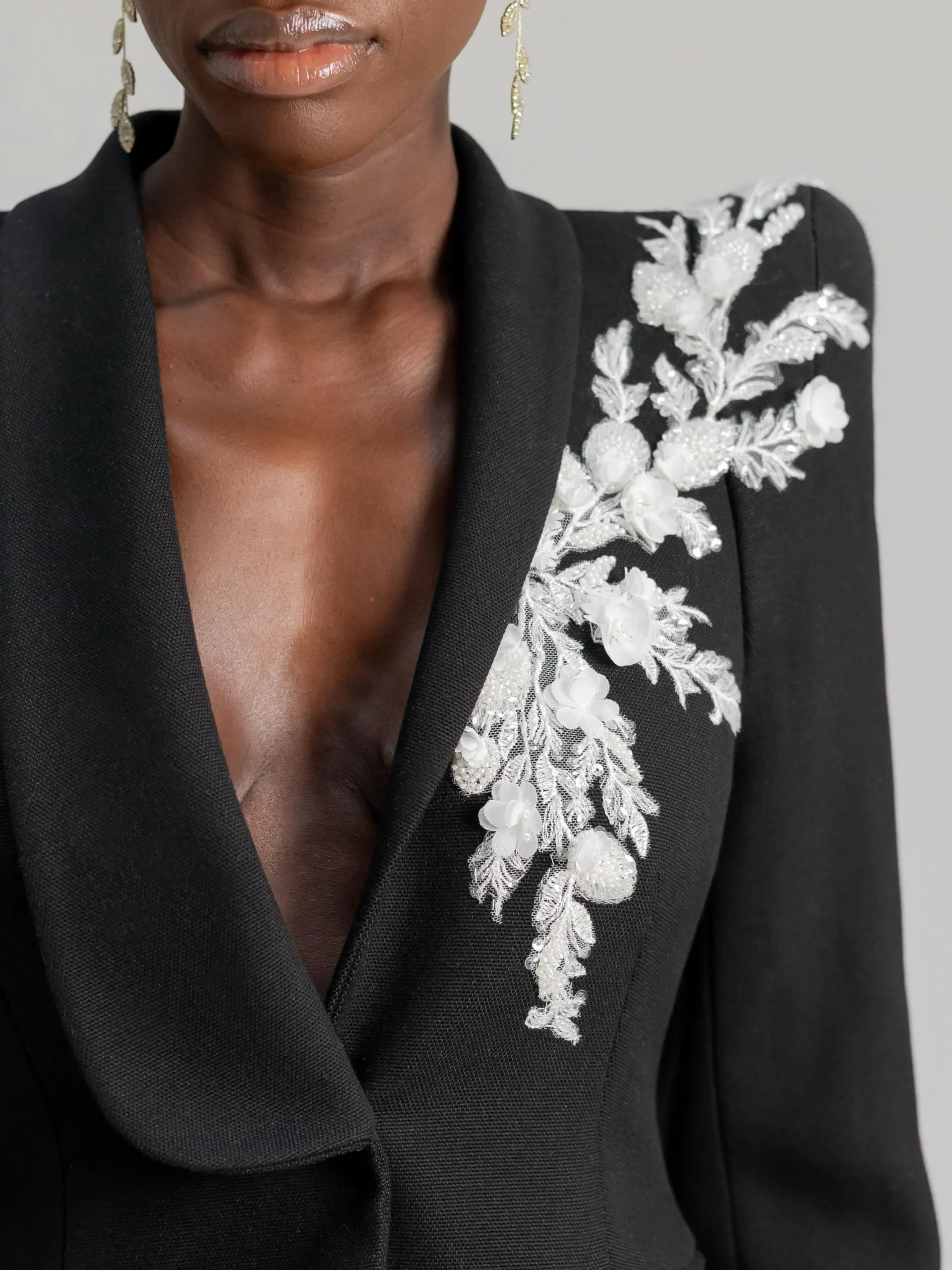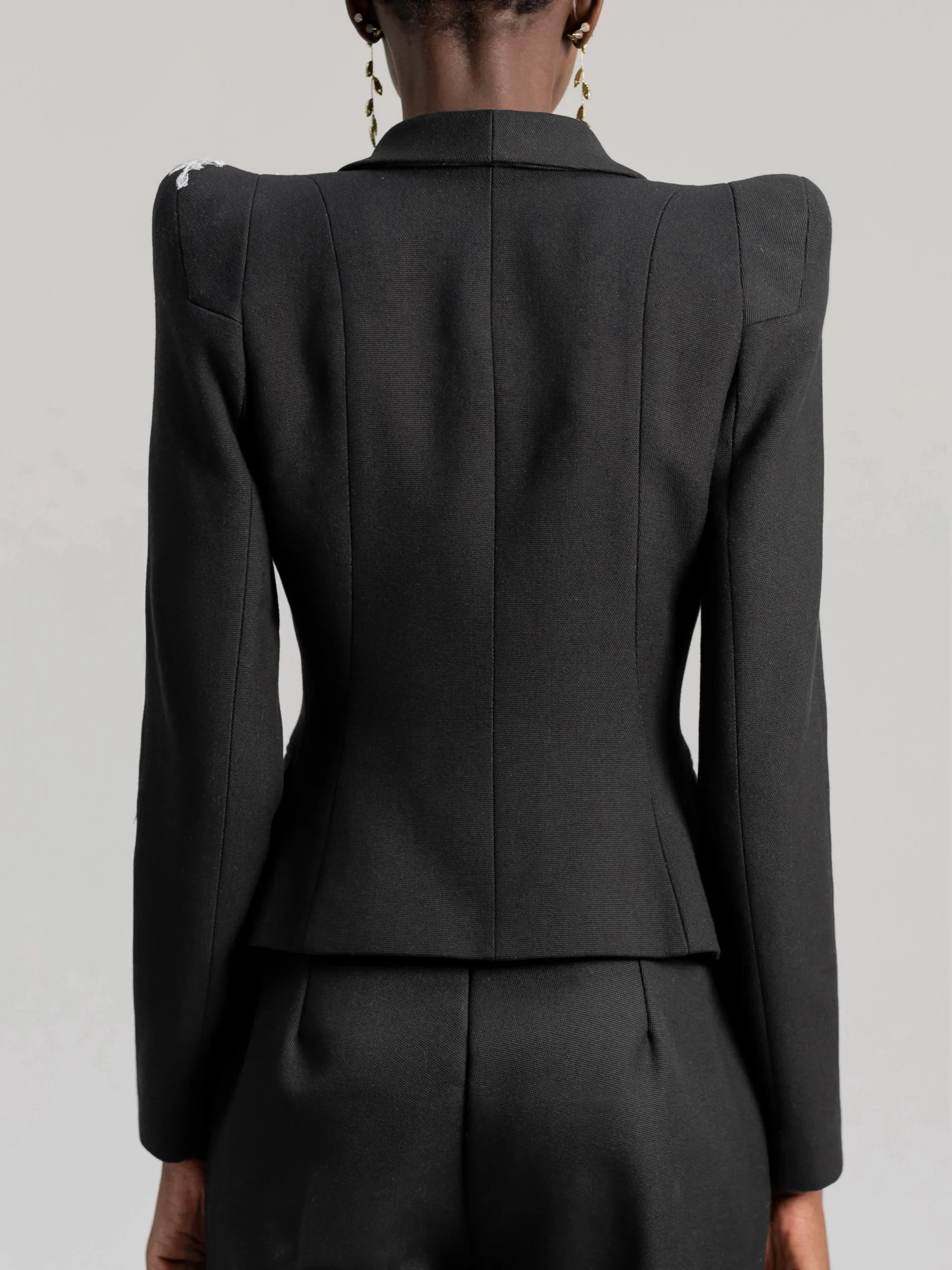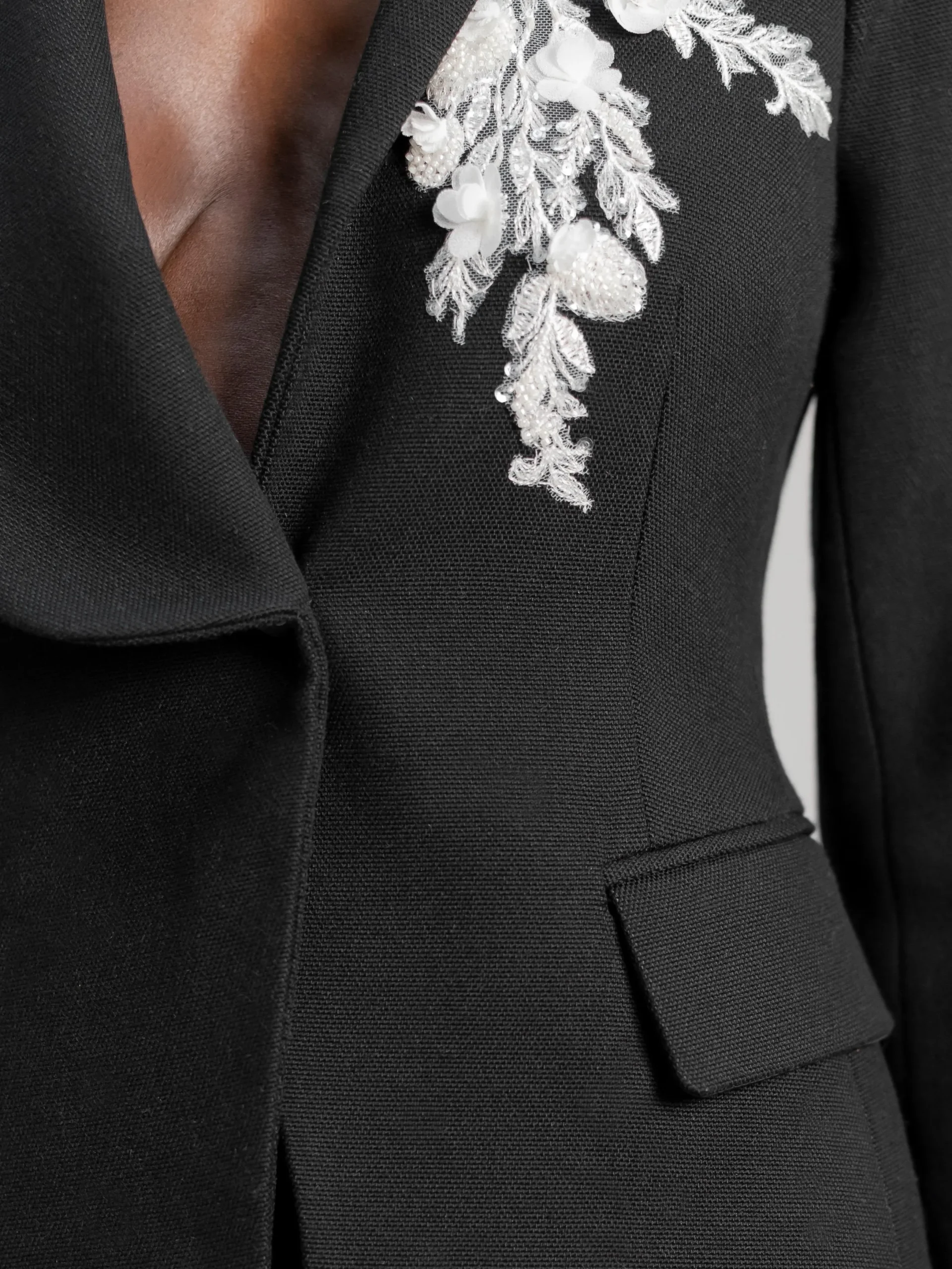 épaules structurées. Ce modèle présente un revers arrondi, des